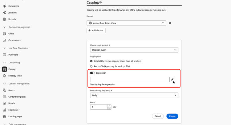 accordion Seuil d’expression Au lieu d’utiliser une valeur statique pour le seuil de limitation, vous pouvez définir votre propre expression. Vous pouvez ainsi calculer le seuil de manière dynamique à l’aide d’attributs de décision et/ou d’attributs externes d’un jeu de données Adobe Experience Platform.