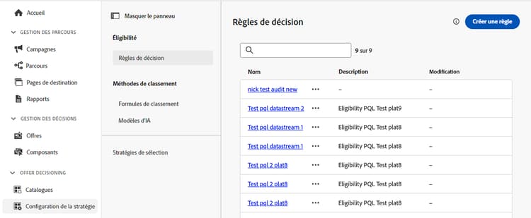 La liste des règles est accessible dans le menu Prise de décision > Configuration de la stratégie.