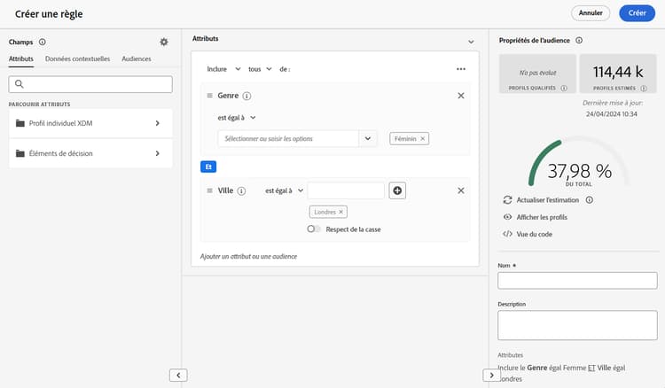 Souvent, il s’agit d’une combinaison de plusieurs attributs, en plus des événements de comportement du client et des données contextuelles. Pour gagner du temps et économiser des efforts, vous pouvez créer des règles de ciblage une seule fois et les réutiliser dans vos parcours et campagnes, avec la possibilité de les modifier rapidement en ligne au moment de la création.