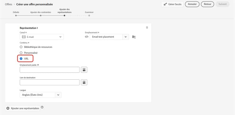 Si vous indiquez un lien de destination, vous pouvez également personnaliser l’URL vers laquelle seront dirigés les utilisateurs et utilisatrices qui cliquent sur l’offre.