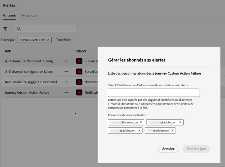 Pour ajouter d’autres personnes abonnées, saisissez les adresses e-mails séparées par des virgules, puis sélectionnez Mettre à jour.