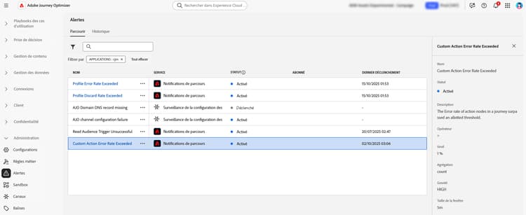 Dans le menu de gauche, sous Administration, cliquez sur Alertes. Plusieurs alertes préconfigurées pour Journey Optimizer sont disponibles dans l’onglet Parcourir.