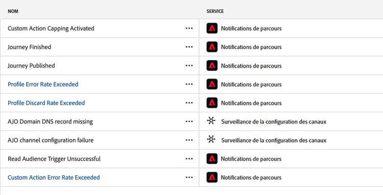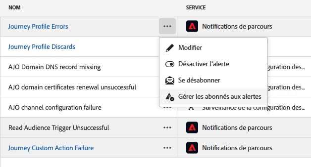 En outre, lorsqu’un certain ensemble de conditions est atteint, des messages d’alerte peuvent être envoyés à toutes les personnes de votre organisation qui se sont abonnées à ces messages. Ces alertes sont disponibles à partir du menu dédié Alertes. Adobe Experience Platform fournit plusieurs règles d’alerte prédéfinies que vous pouvez activer pour votre organisation. En outre, vous pouvez vous abonner à des alertes système spécifiques à Adobe Journey Optimizer, comme indiqué sur cette page.