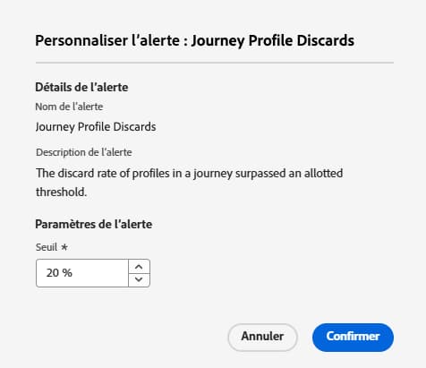 Cette alerte vous avertit si le ratio des profils erronés par rapport aux profils ayant rejoint le parcours au cours des 5 dernières minutes a dépassé le seuil. Le seuil par défaut est défini sur 20 %, mais vous pouvez définir un seuil personnalisé.