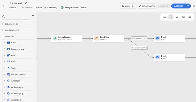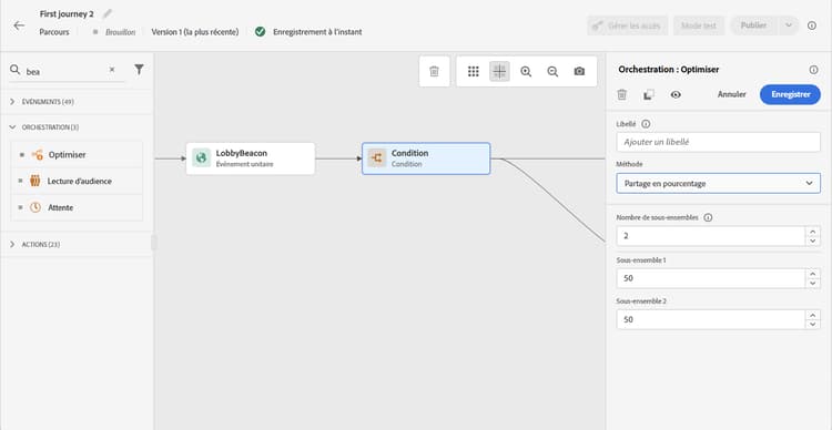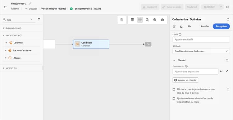 L’activité Condition vous permet de définir la progression des individus dans votre parcours en créant plusieurs chemins d’accès en fonction de critères spécifiques. Vous pouvez également configurer un autre chemin pour gérer les temporisations ou les erreurs, assurant ainsi une expérience fluide.