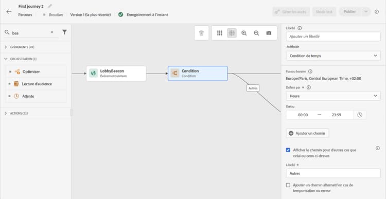 Le fuseau horaire n’est plus spécifique à une condition et est désormais défini au niveau du parcours dans les propriétés de celui-ci. En savoir plus sur cette page.