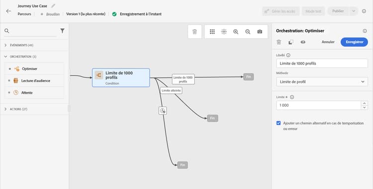 Le compteur s’applique uniquement à la version du parcours sélectionnée. Le compteur se réinitialise à zéro lorsque le parcours est dupliqué ou qu’une nouvelle version est créée. Après une réinitialisation, les profils entrants reprennent le chemin nominal jusqu’à ce que la limite de compteur soit atteinte.