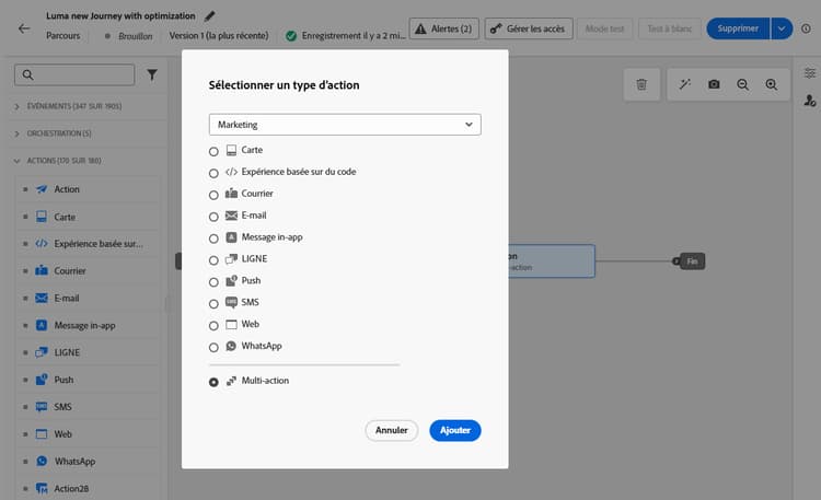 Journey Optimizer est fourni avec une nouvelle activité Action générique qui permet de configurer une action de canal intégrée unique, ainsi que plusieurs activités entrantes.