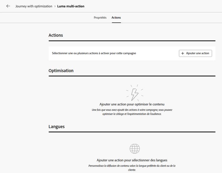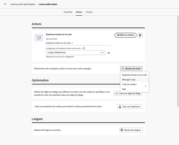 Utilisez la section Langues pour créer du contenu dans plusieurs langues au sein de votre action de parcours. Pour ce faire, cliquez sur le bouton Ajouter des langues et sélectionnez les paramètres de langue souhaités.