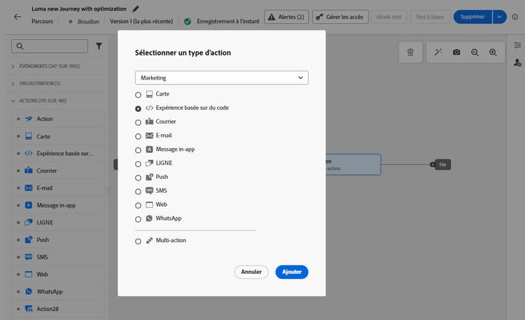Pour ajouter une action de canal intégrée à un parcours, procédez comme suit :