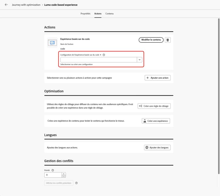 Dans la section Gestion des conflits, attribuez un score de priorité à l’action de parcours, ce qui vous permet de donner la priorité à une action entrante lorsque plusieurs actions de parcours ou campagnes utilisent la même configuration des canaux.