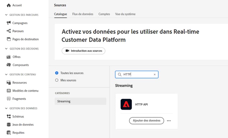 Dans Adobe Experience Platform, cliquez sur Sources sous Connexions dans le menu de gauche. Sous API HTTP, cliquez sur Ajouter des données.