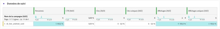 Le tableau Données de suivi offre un instantané détaillé de l’activité de profil liée à vos cartes de contenu, fournissant des informations essentielles sur l’engagement et l’efficacité des cartes de contenu.