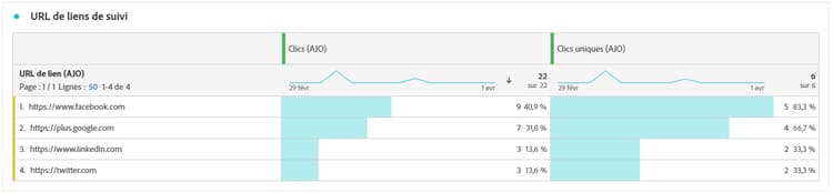 Le tableau URL des liens de suivi fournit une vue d’ensemble complète des URL de votre e-mail qui attirent le plus de visiteurs et de visiteuses. Cela vous permet d’identifier et de hiérarchiser les liens les plus populaires, ce qui améliore votre compréhension de l’engagement des profils avec du contenu spécifique dans vos e-mails.