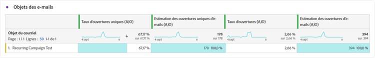 Estimation des ouvertures : estimation du nombre total d’ouvertures d’e-mails, prenant en compte les ouvertures directes par les profils et les ouvertures automatisées déclenchées par les serveurs de messagerie. Cette mesure prend en compte les ouvertures déclenchées par les serveurs de messagerie à des fins d’analyse de la confidentialité ou de la sécurité en appliquant un taux d’ouverture calculé à partir des destinataires qui ont ouvert manuellement l’e-mail par rapport à ceux dont les e-mails n’ont été ouverts que par des serveurs de messagerie.