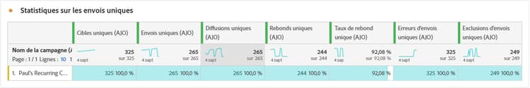 Le tableau Statistiques d’envois uniques présente une vue d’ensemble détaillée des mesures de performances des e-mails uniques dans vos campagnes. Il se concentre sur les profils individuels, tels que ceux qui sont ciblés, reçoivent un envoi, font l’objet d’un rebond ou sont exclus de manière unique, ce qui permet d’obtenir des informations plus détaillées sur la manière dont vos e-mails atteignent votre audience et l’engagent.