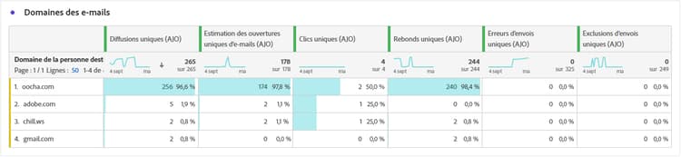 Le tableau Domaines d’e-mails propose une répartition détaillée des e-mails classés par domaine, fournissant des informations détaillées sur les mesures de performances de vos campagnes par e-mail. Cette analyse exhaustive vous permet de comprendre le comportement de différents domaines en réponse au contenu de vos e-mails.