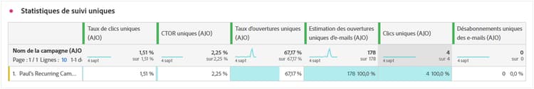Le tableau Statistiques de tracking unique fournit une vue ciblée de l’engagement au niveau du profil avec les e-mails de votre campagne. Il met en évidence des mesures uniques offrant des informations précieuses sur la manière dont les profils individuels interagissent avec le contenu de vos e-mails à travers les étapes clés de l’engagement.