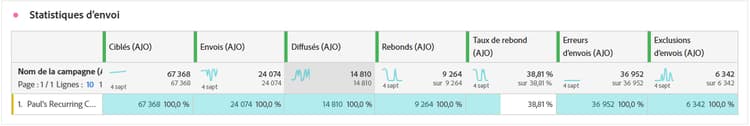 Le tableau Statistiques d’envoi fournit un résumé complet des données essentielles concernant les e-mails dans vos campagnes. Il détaille les mesures clés, telles que les interactions avec vos e-mails et le nombre d’e-mails diffusés, ce qui vous permet d’obtenir des informations précieuses sur l’efficacité et la portée de vos e-mails et campagnes.