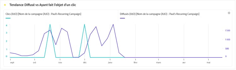 Le graphique Tendance des diffusions et clics présente une analyse détaillée de l’engagement de vos profils avec vos e-mails, offrant des informations précieuses sur la manière dont les profils interagissent avec votre contenu. Le graphique utilise deux axes pour afficher les e-mails et les clics diffusés côte à côte, ce qui permet de repérer plus facilement les modèles inhabituels ou les changements d’engagement par rapport au nombre d’e-mails envoyés.