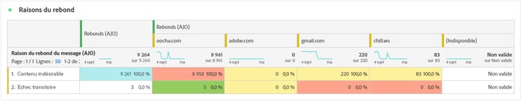 Le tableau Raisons de rebond compile les données disponibles relatives aux rebonds de messages, fournissant des informations détaillées sur les raisons spécifiques des rebonds d’e-mails.