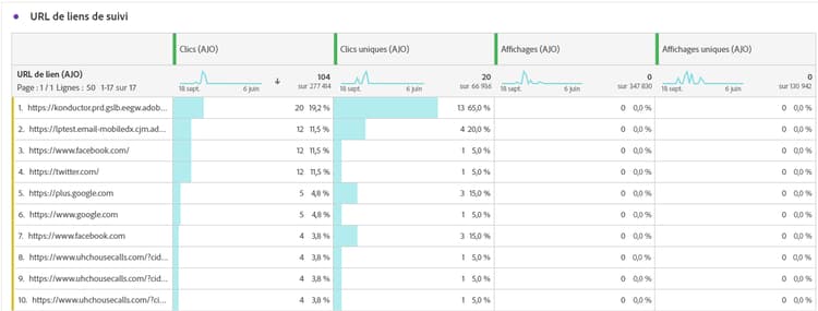 Le tableau URL des liens de suivi fournit une vue d’ensemble complète des URL de vos messages in-app qui attirent le plus de visiteurs et de visiteuses. Cela vous aide à détecter les liens les plus populaires et à les hiérarchiser, améliorant ainsi votre compréhension de l’engagement des profils avec un contenu spécifique dans vos messages in-app.