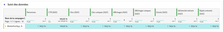 Le tableau Données de suivi offre un instantané détaillé de l’activité de profil liée à vos messages in-app, fournissant des informations essentielles sur l’engagement et l’efficacité des messages in-app.