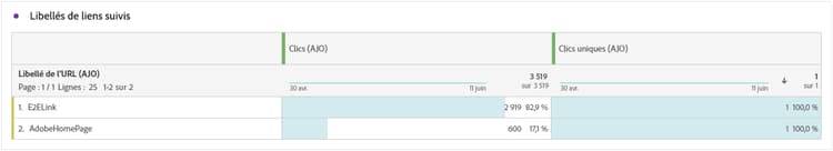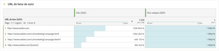 Le tableau URL des liens de suivi fournit une vue d’ensemble complète des URL de vos notifications push qui attirent le plus de visiteurs et de visiteuses. Cela vous permet d’identifier et de hiérarchiser les liens les plus populaires, ce qui améliore votre compréhension de l’engagement des profils avec du contenu spécifique dans vos notifications push.