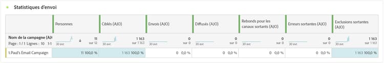 Le tableau Statistiques d’envoi fournit un résumé complet des données essentielles concernant vos campagnes par notification. Il détaille les mesures clés, telles que la taille de l’audience ciblée et le nombre de notifications push diffusées avec succès, ce qui vous permet d’obtenir des informations précieuses sur l’efficacité et la portée de votre notification push.