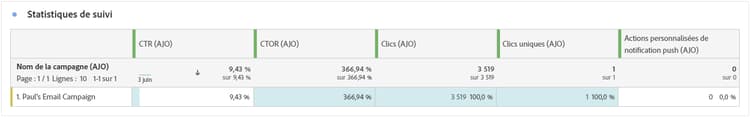 Le tableau Statistiques de suivi offre un instantané détaillé de l’activité de profil liée à vos notifications push, fournissant des informations essentielles sur l’engagement et l’efficacité des notifications push.