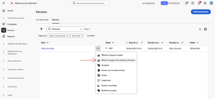 Accédez au rapport de parcours actif à partir du menu Parcours en ouvrant le menu Autres actions de votre parcours et en sélectionnant Afficher le rapport des dernières 24 heures.
