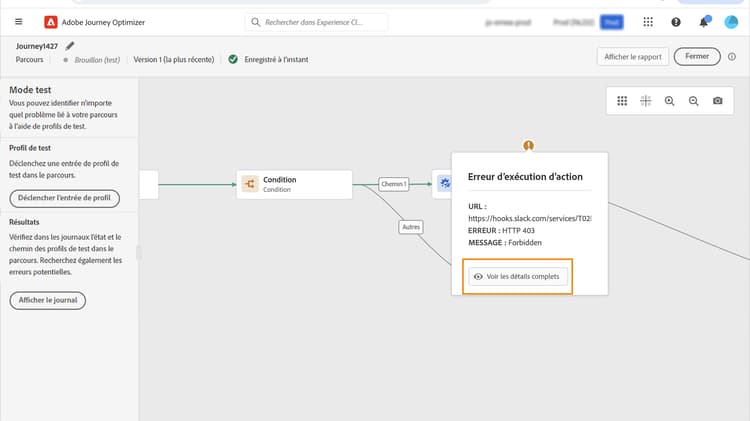 Vérifiez votre rapport de parcours 🔗 pour voir les raisons de l'erreur sur l'action.