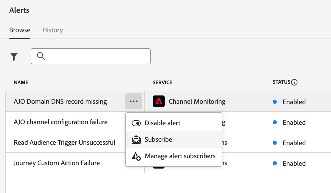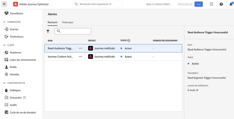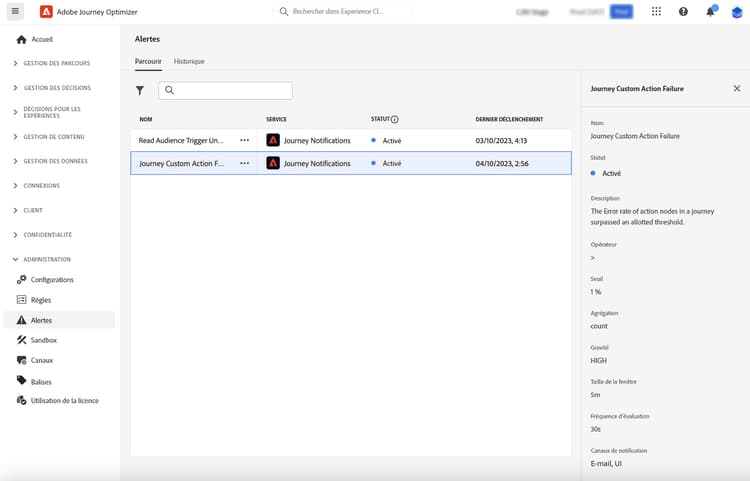 Dans le menu de gauche, sous Administration, cliquez sur Alertes. Plusieurs alertes préconfigurées pour Journey Optimizer sont disponibles dans l’onglet Parcourir.