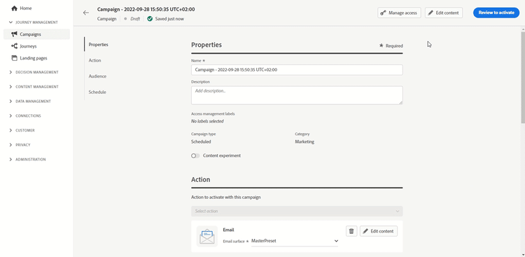 Outre les campagnes planifiées existantes, vous pouvez désormais créer des campagnes déclenchées par l’API dans Journey Optimizer et les appeler à partir d’un système externe à l’aide d’API.