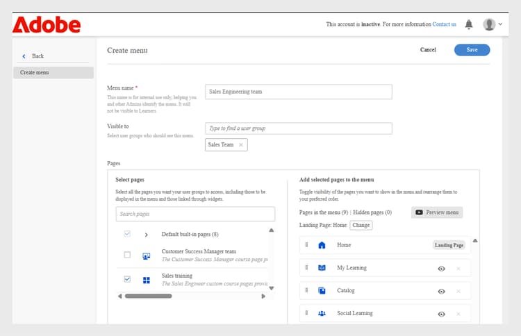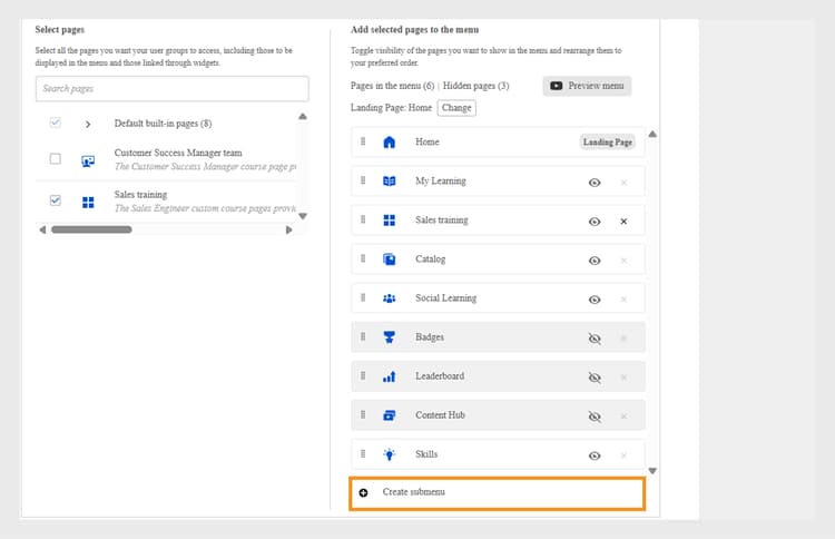 En tant qu’administrateur d’une société financière comptant deux équipes principales, les directeurs commerciaux et les directeurs de la réussite client (CSM), vous devez créer des menus distincts avec leurs pages respectives. Cela permet aux élèves de trouver facilement des cours pertinents pour leurs rôles dans leur propre menu.
