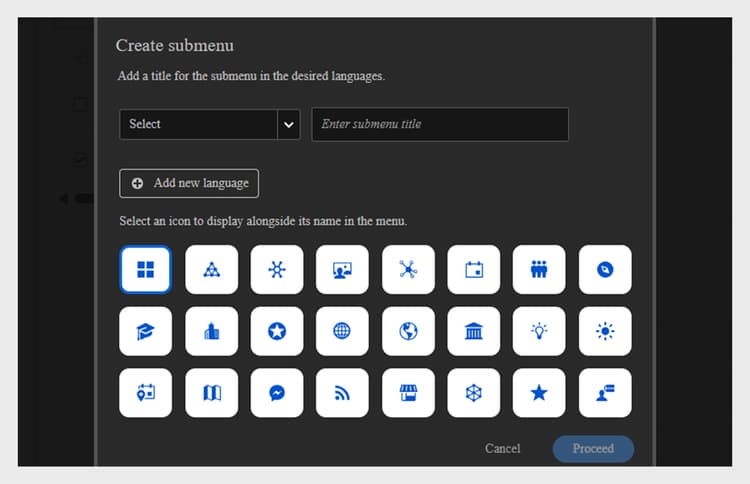 Invite de sous-menu affichant des options pour sélectionner le titre, la langue et l'icône du sous-menu à afficher dans le menu -