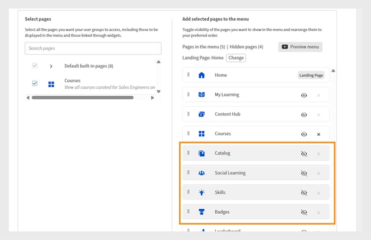 Écran de configuration du menu affichant les pages masquées telles que le catalogue, l’apprentissage par les réseaux sociaux, les compétences et les badges