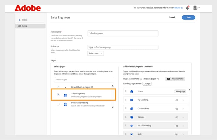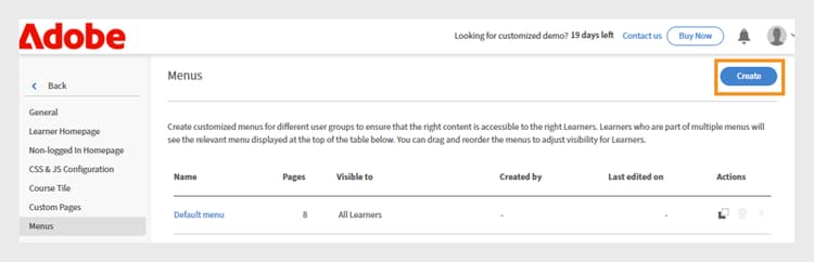- Pages intégrées : il s’agit des pages par défaut fournies avec Adobe Learning Manager, telles que Accueil, Mon apprentissage et Catalogue. Les administrateurs ne peuvent pas supprimer les pages intégrées du menu. Ils peuvent masquer les pages du menu.