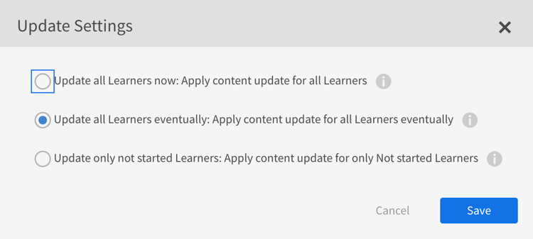 - La mise à jour n'a pas encore commencé pour les élèves : appliquez la mise à jour uniquement aux élèves qui n'ont pas encore commencé le cours. Les élèves en cours et terminés restent sur la version d'origine.