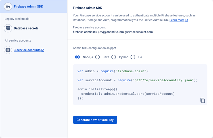 - Vous pouvez télécharger le fichier Json du compte de service à partir de la console Firebase.
