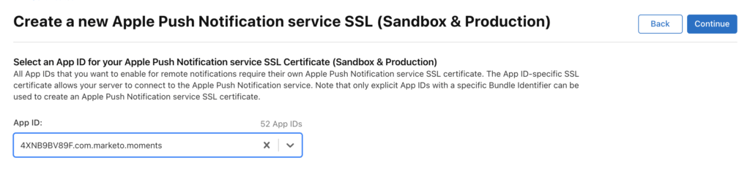 - Activez la case à cocher « SSL du service de notification push Apple (sandbox et production) », puis cliquez sur « Continuer ».