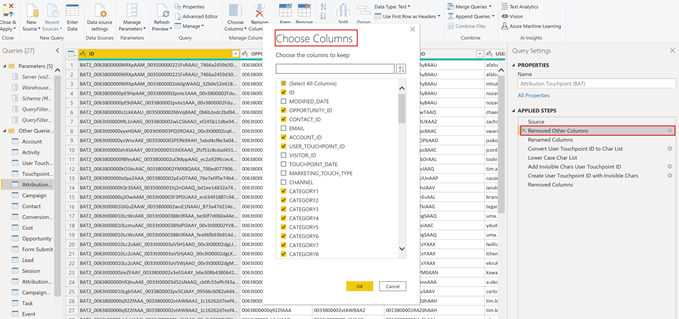 Pour simplifier le modèle de données et supprimer les données redondantes et inutiles, nous avons réduit le nombre de colonnes importées dans Power BI depuis le tableau Snowflake d’origine. Les colonnes supprimées comprennent les clés étrangères inutiles, les données dimensionnelles dénormalisées mieux exploitées par le biais de relations avec d’autres tableaux dans le modèle, les colonnes d’audit et les champs utilisés pour les traitements Marketo Measure internes. Vous pouvez ajouter ou supprimer des colonnes en fonction des besoins de votre entreprise. Accédez à l’étape « Autres colonnes supprimées » après l’étape « Source » dans n’importe quel tableau, cliquez sur l’icône en forme d’engrenage, puis mettez à jour les colonnes sélectionnées dans la liste fournie.