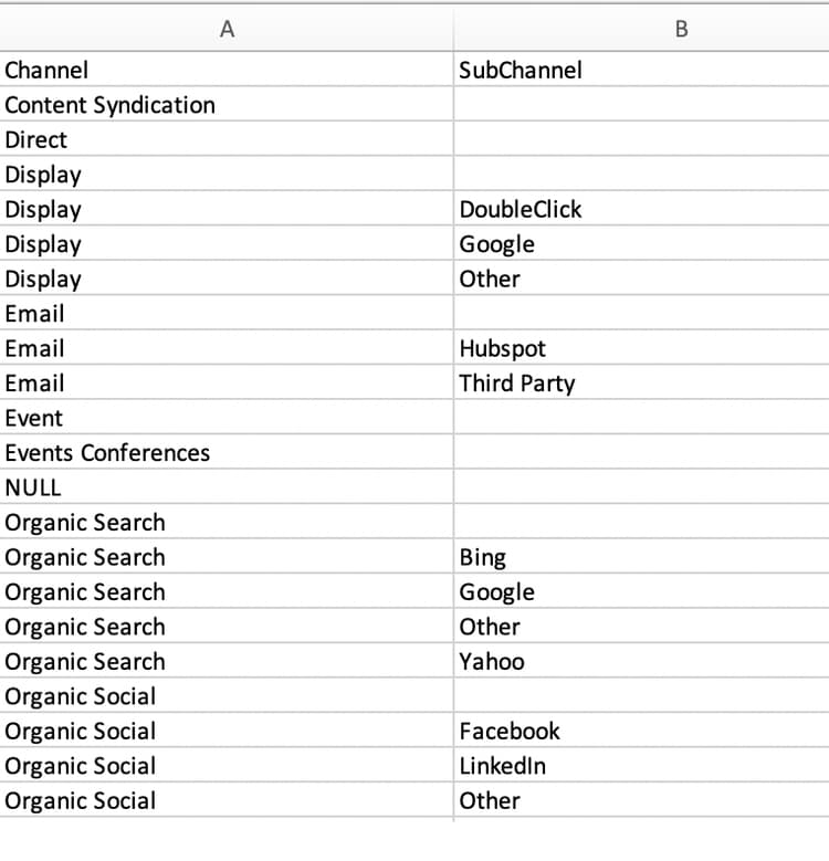 Le total de tous les sous-canaux n’a pas besoin de faire la somme des valeurs saisies dans le canal, mais il ne peut pas être supérieur à toutes les valeurs saisies dans le canal. Si la somme est inférieure à la valeur saisie dans le canal, Marketo Measure ajoutera automatiquement une ligne pour « Autre » pour couvrir la différence et remplir les trous.