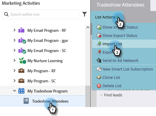 Dans la liste Participantes et participants au salon professionnel, cliquez sur Actions de liste et sélectionnez Importer la liste.