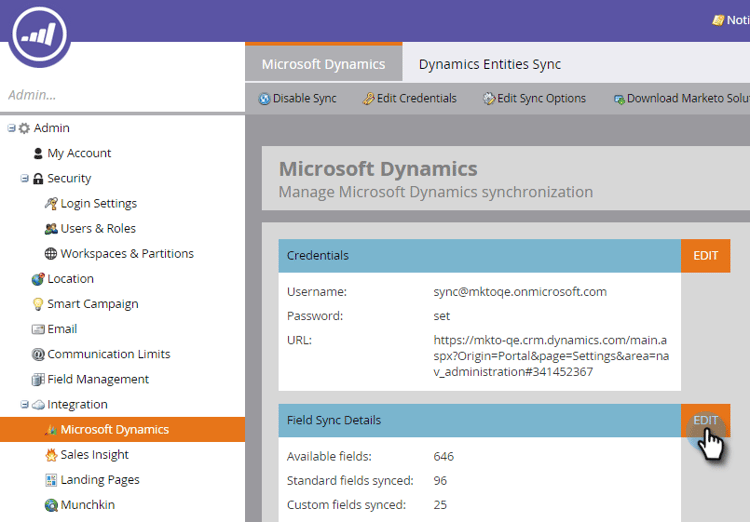 - Le nom d’utilisateur dans Marketo doit correspondre au nom d’utilisateur pour l’utilisateur de synchronisation dans CRM. Le format peut être