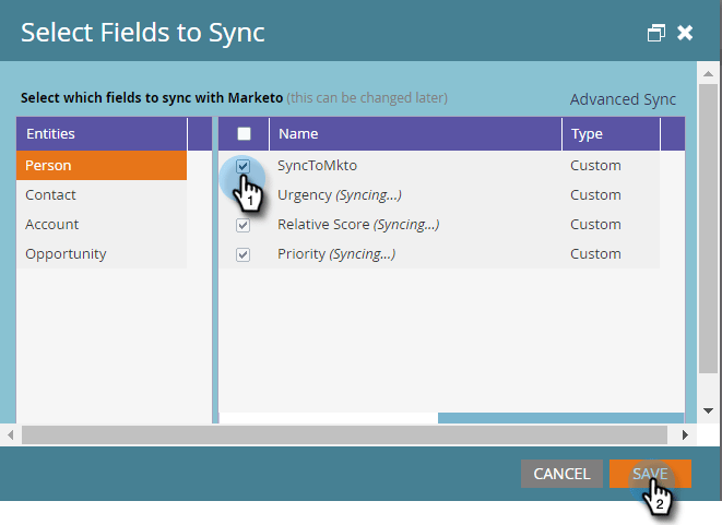 Sélectionnez les champs que vous souhaitez synchroniser avec Marketo afin qu’ils soient présélectionnés. Cliquez sur Enregistrer