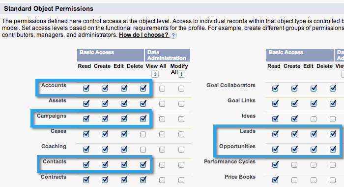 Dans la section Autorisations d’objet standard , assurez-vous que les autorisations Lecture, Création, Modification et Suppression sont cochées pour :