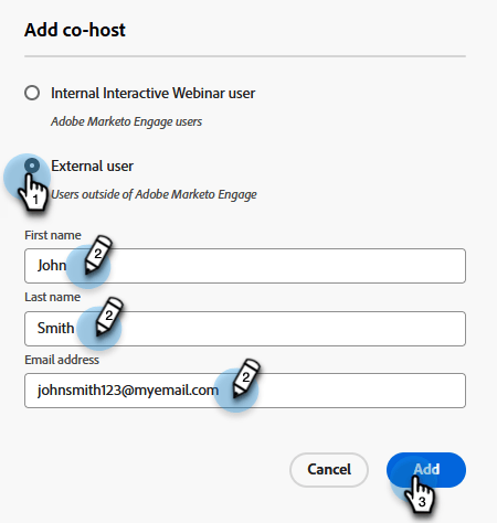 Saisissez le prénom, le nom et l’adresse e-mail du co-hôte souhaité. Cliquez sur Ajouter.