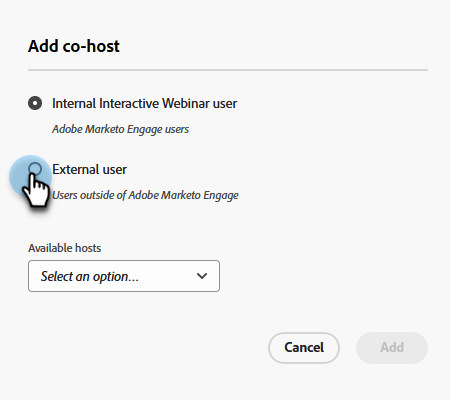 note note NOTE Si vous sélectionnez Utilisateur de webinaire interactif interne, il vous suffit de cliquer sur le menu déroulant Hôtes disponibles et de choisir dans la liste des personnes qui ont été ajoutées en tant qu’utilisateurs de webinaires interactifs dans Marketo Engage. Les hôtes existants ne se verront pas dans cette liste déroulante, car il s’agit déjà d’hôtes. -