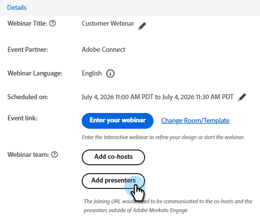Dans la page Aperçu du webinaire interactif, cliquez sur Ajouter des présentateurs.